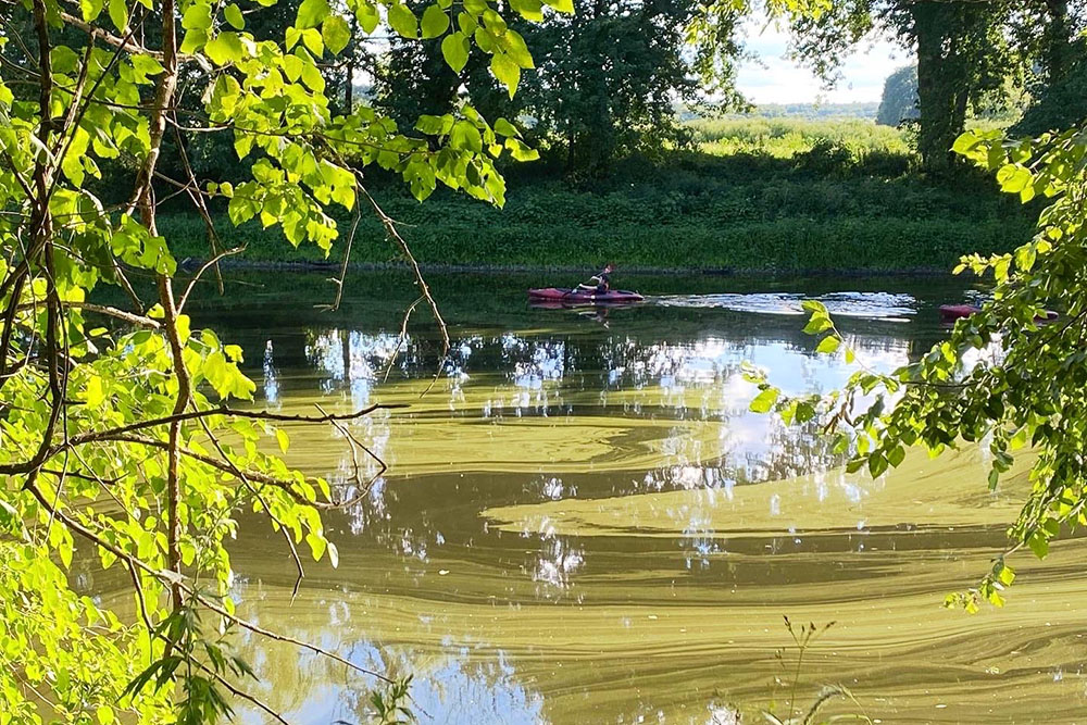 Photo: Wallkill River showing HABs and kayaker. Photo by Emily Vail