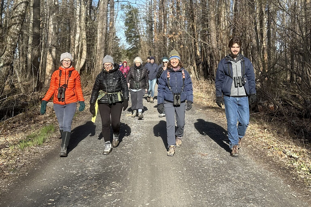 This spring, Susan Fox Rogers, visiting associate professor of writing, is leading Monday morning birding walks from 7 to 9 am down Cruger Island Road on Bard College’s campus. The walks, which will continue through May 27, draw an intergenerational audience and are part of a greater environmental education initiative at the Red Hook Public Library, where Rogers is the inaugural Ascienzo Naturalist in Residence. Typically, participants will spot at least four of the Hudson Valley’s most common birds: robins, chickadees, tufted titmouses, and white-breasted nuthatches. On occasion, birders will spy more unusual specimens. “On these morning walks, we have seen eagles and listened to winter wrens, spied a rare rusty blackbird with its blazing white eyes, and delighted in the wood ducks crying as they take flight,” Rogers says. Biology major William Mennerick ’25, who took up birding during the pandemic, enjoys the walks. “I love birds,” he said. “I savor the weekly evolution of the landscape over spring. It’s amazing when vegetation starts to come in and then we wait for the spring chorus of songbirds, all at once.”