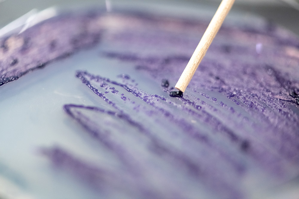 Photo: Violacein, a purple pigment produced by bacteria, which Jude discovered in a water sample from the Hudson River Valley watershed and studies in her labs. Photo by Karl Rabe