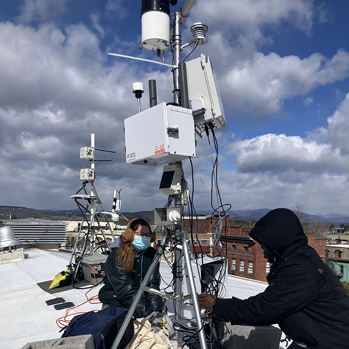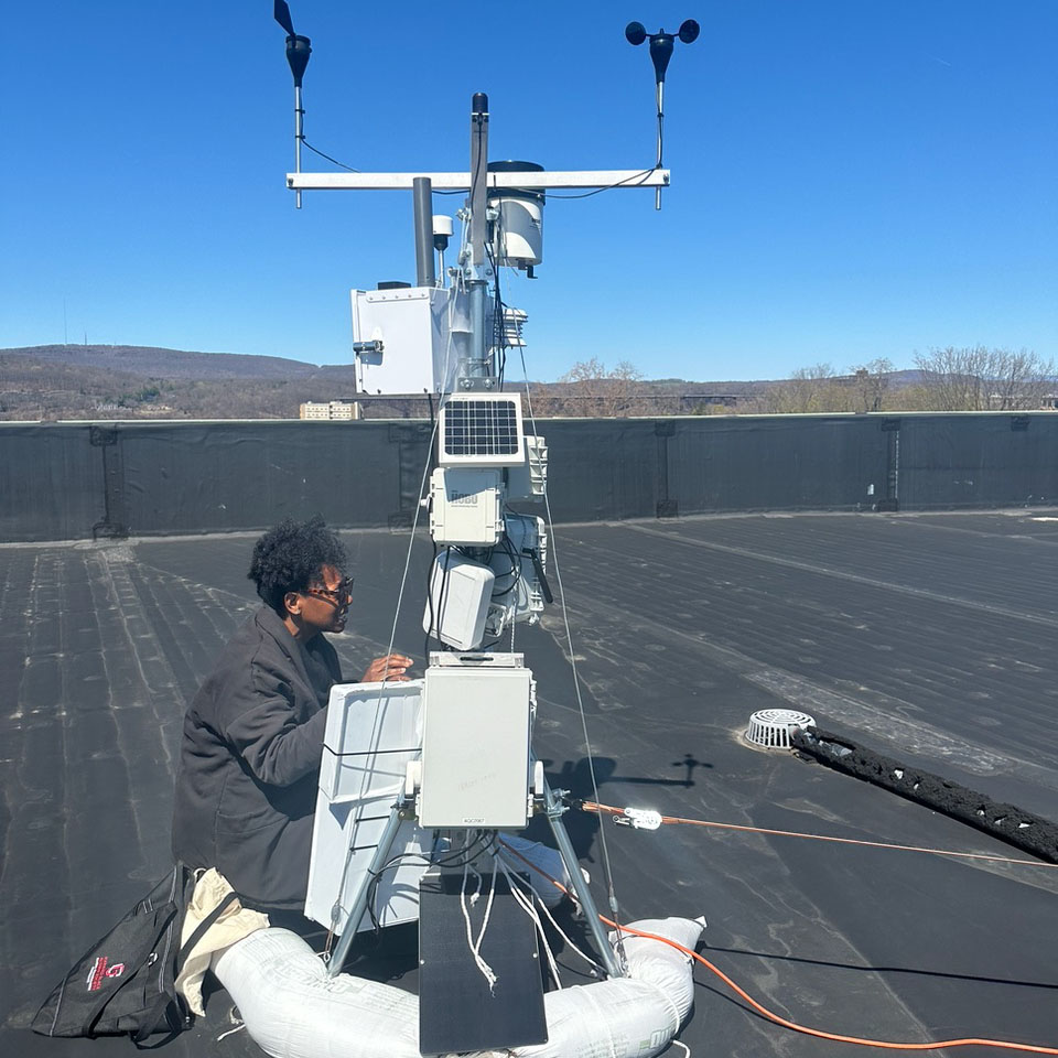 Photo: Bard Community Sciences Lab Manager Desiree Lyle installs an air quality monitor for the Poughkeepsie Regional Air Quality Station (Adriance Memorial Library). Photo by Julia Beeman