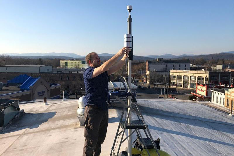 Photo: Dr. Eli Dueker installing a MetOne 212-2 particle profiler atop the Andy Murphy Neighborhood Center in Midtown Kingston. Courtesy City of Kingston